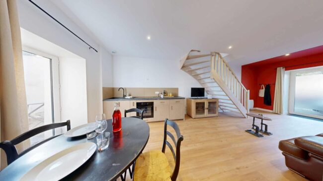 Visite virtuelle – Maison location Saint Gilles Croix de VieCe duplex de 60,0 m² à Saint Gilles Croix de Vie en France allie fonctionnalité et style. Le rez-de-chaussée (44,0 m²) comprend un espace de vie ouvert avec une cuisine moderne, un coin repas et un salon. Les salles de bains aux accents bleus présentent un…